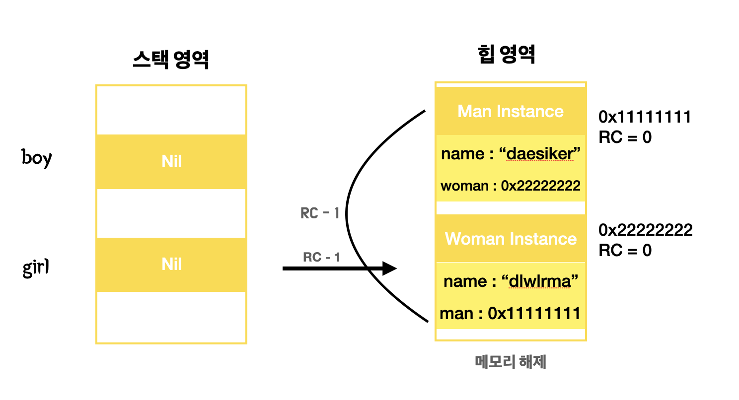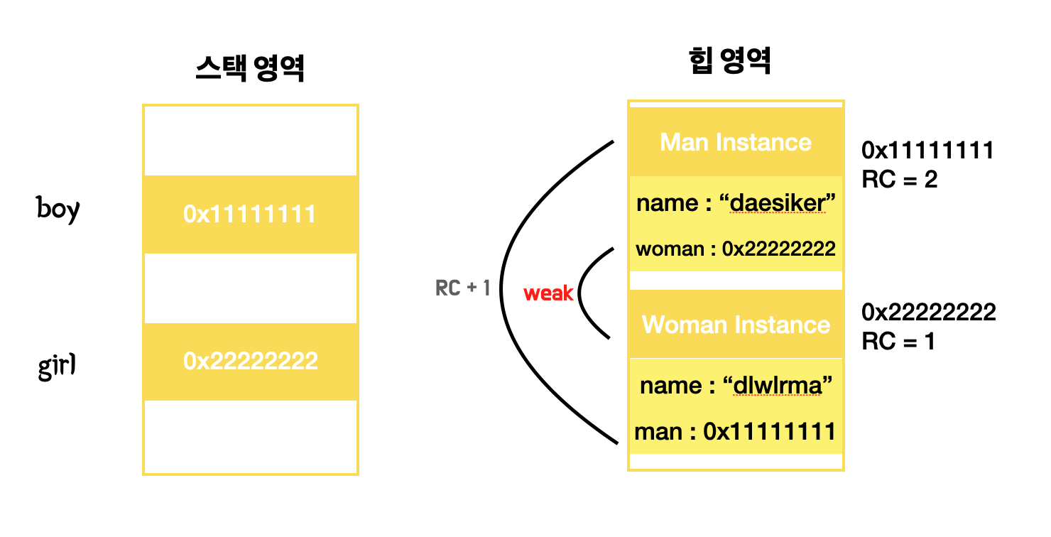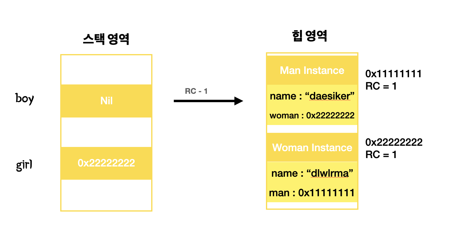 서로 다른 객체를 순환 참조하였다. 하지만 Man Class의 멤버 woman은 약한 참조로 선언이 되어 있어서, 참조를 하였지만 Woman Instance의 RC는 증가하지 않고 1이 유지된다.
