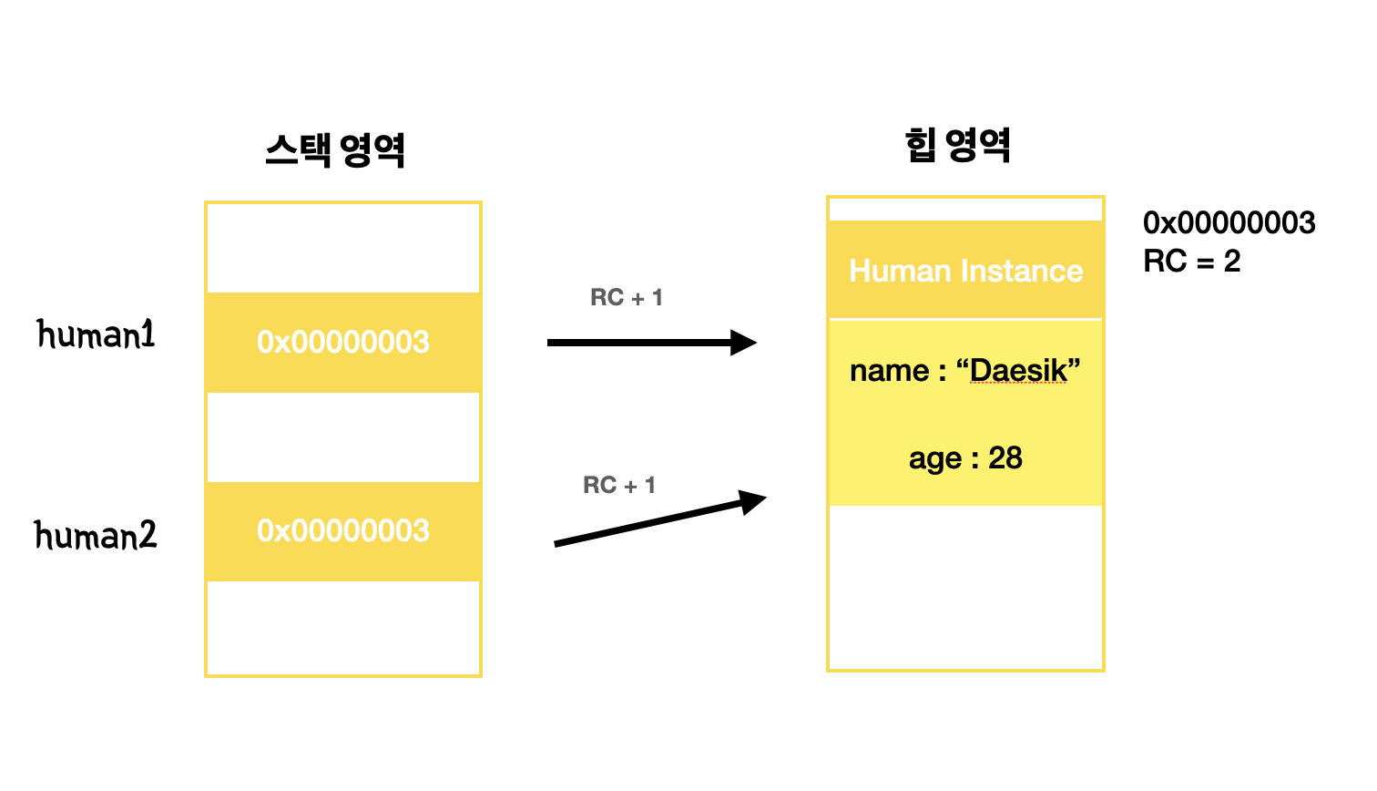 var human1:Human? = Human(28, "Daesik") // ARC : 1