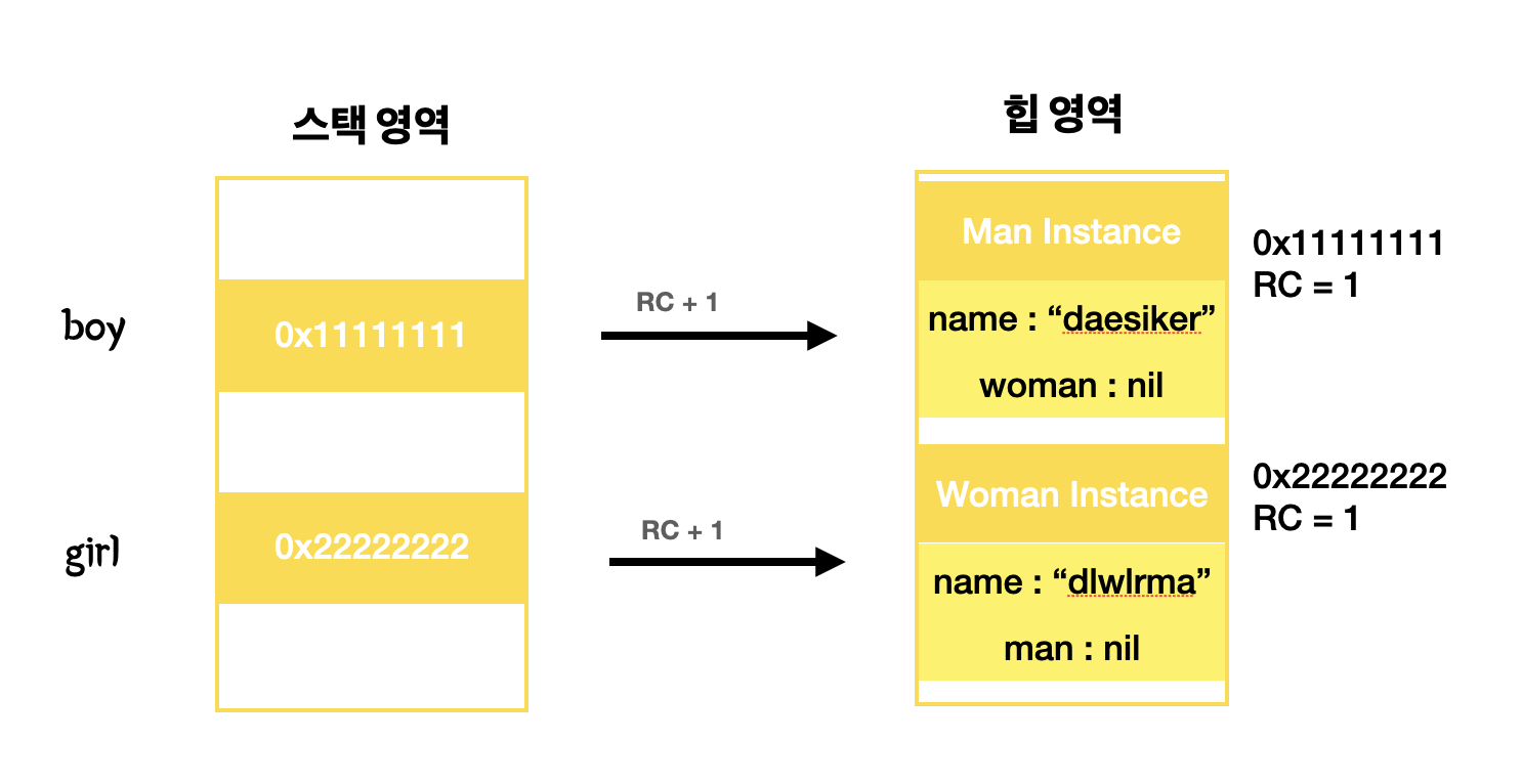 Man 인스턴스인 boy와 Woman 인스턴스인 girl을 선언 하였다. 이 때 힙영역과 스택 영역에 데이터가 할당 되고 RC 카운트는 각각 1이 된다.