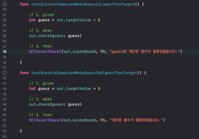 테스트 함수에 내용은 targetValue보다 크거나 작은 숫자를 입력하였을 때 정상적으로 scoreRound가 적용이 되는지 알아보는 내용이다. 테스트는 3가지 단계로 구성되어 있다.