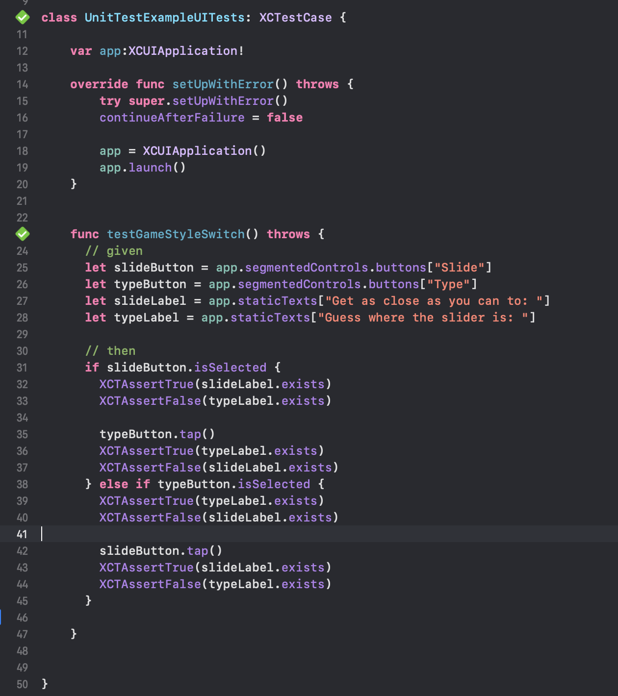 XCUIApplication에는 segmentedControls, staticTexts, buttons 등 다양한 UI Components를 담는 딕셔너리가 존재한다. 해당 딕셔너리의 키값은 label의 텍스트 값이나 버튼의 title로 확인이 가능하다. 이 테스트에서는 given 주석 아래에서 “Slide”와 “Type” 란 타이틀을 가진 segmentedControl 컴포넌트를 선언했고, 거기에 맞는 레이블들을 추가로 선언하였다.