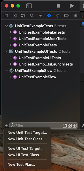 xCode 사이드바에 “Show the test navigator” 버튼을 클릭하면 UI 및 Unit 테스트 목록들이 나타나는 걸 알 수 있는데 하단에 “+” 버튼을 통해 새롭게 추가할 수 있다.