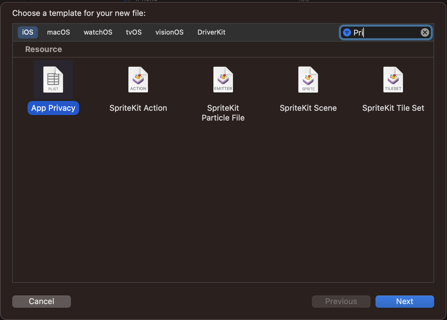 방법은 비교적 간단하다. Info.plist와 동일한 plist 파일인 AppPrivacy를 만들고 이름을 PrivacyInfo로 만들면된다. New File → filter을 통해 App Privacy를 검색하면 금방 찾을 수 있다.